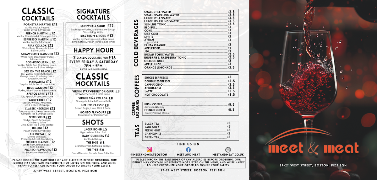 Welcome to Meet & Meat, a culinary gem nestled in the heart of Boston at 27-29 West St. This restaurant excels in delivering a vibrant dining experience with a menu that celebrates high-quality meats and an array of flavors. Guests rave about the delicious lamb chops, perfectly cooked steaks, and mouthwatering seafood risotto, which showcase the chef's craftsmanship and commitment to quality.